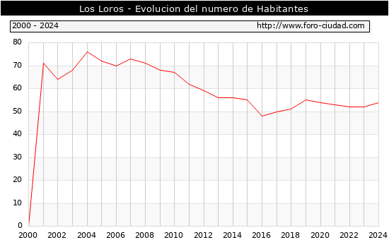 Segun los datos publicados por el INE a 1 de Enero de 2024 el numero de habitantes en Los Loros era de 54, 2 habitantes mas que el en el año 2023. En el grafico siguiente se puede ver cuantos habitantes tiene Los Loros a lo largo de los años.