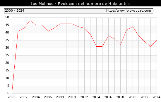 el numero de habitantes en Los Molinos era de 35, 4 habitantes mas que el en el año 2023. En el grafico siguiente se puede ver cuantos habitantes tiene Los Molinos a lo largo de los años.
