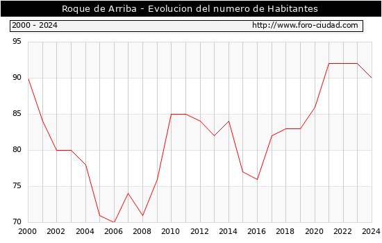 el numero de habitantes en Roque de Arriba era de 90, 2 habitantes menos que el en el año 2023. En el grafico siguiente se puede ver cuantos habitantes tiene Roque de Arriba a lo largo de los años.
