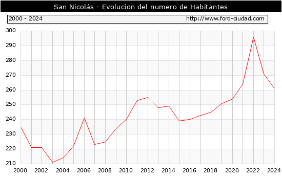 el numero de habitantes en San Nicolás era de 261, 10 habitantes menos que el en el año 2023. En el grafico siguiente se puede ver cuantos habitantes tiene San Nicolás a lo largo de los años.