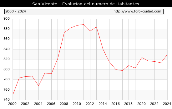 el numero de habitantes en San Vicente era de 830, 17 habitantes mas que el en el año 2023. En el grafico siguiente se puede ver cuantos habitantes tiene San Vicente a lo largo de los años.