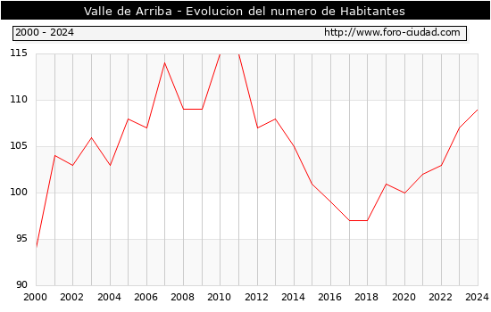 el numero de habitantes en Valle de Arriba era de 109, 2 habitantes mas que el en el año 2023. En el grafico siguiente se puede ver cuantos habitantes tiene Valle de Arriba a lo largo de los años.