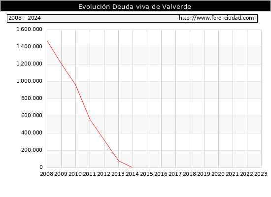 | Valverde - Deuda viva del Ayuntamiento a 31/12/2024 Valverde - Deuda viva del Ayuntamiento a 31/12/2024 Segun el Ministerio de Economia y Hacienda el Ayuntamiento de Valverde a 31/12/2024 posee una deuda de 0 € . La deuda viva a 31/12/2023 ascendia a 0 € por lo que en el ultimo año la deuda se mantuvo igual.