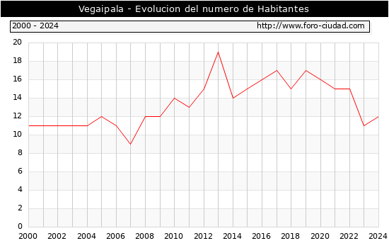 el numero de habitantes en Vegaipala era de 12, 1 habitantes mas que el en el año 2023. En el grafico siguiente se puede ver cuantos habitantes tiene Vegaipala a lo largo de los años.