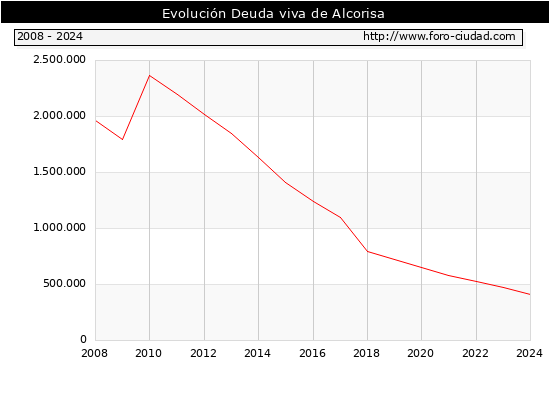 Alcorisa - Deuda viva del Ayuntamiento a 31/12/2024 Alcorisa - Deuda viva del Ayuntamiento a 31/12/2024 Segun el Ministerio de Economia y Hacienda el Ayuntamiento de Alcorisa a 31/12/2024 posee una deuda de 410.000 € . La deuda viva a 31/12/2023 ascendia a 472.000 € por lo que en el ultimo año la deuda se redujo en -62.000 €. ![]()