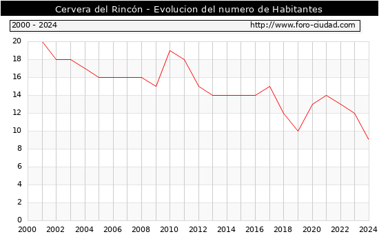 el numero de habitantes en Cervera del Rincón era de 9, 3 habitantes menos que el en el año 2023. En el grafico siguiente se puede ver cuantos habitantes tiene Cervera del Rincón a lo largo de los años.