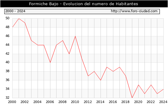 el numero de habitantes en Formiche Bajo era de 34, 1 habitantes mas que el en el año 2023. En el grafico siguiente se puede ver cuantos habitantes tiene Formiche Bajo a lo largo de los años.