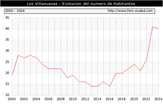 el numero de habitantes en Los Villanuevas era de 40, 1 habitantes menos que el en el año 2023. En el grafico siguiente se puede ver cuantos habitantes tiene Los Villanuevas a lo largo de los años.