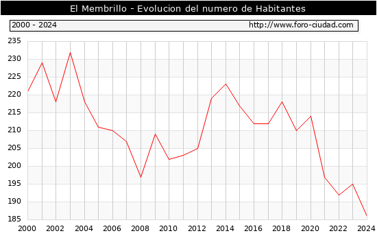 el numero de habitantes en El Membrillo era de 186, 9 habitantes menos que el en el año 2023. En el grafico siguiente se puede ver cuantos habitantes tiene El Membrillo a lo largo de los años.