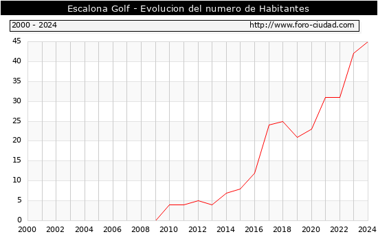 el numero de habitantes en Escalona Golf era de 45, 3 habitantes mas que el en el año 2023. En el grafico siguiente se puede ver cuantos habitantes tiene Escalona Golf a lo largo de los años.