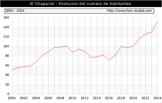 el numero de habitantes en El Chaparral era de 153, 23 habitantes mas que el en el año 2023. En el grafico siguiente se puede ver cuantos habitantes tiene El Chaparral a lo largo de los años.