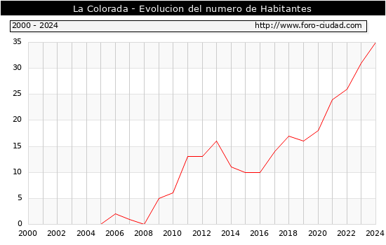 el numero de habitantes en La Colorada era de 35, 4 habitantes mas que el en el año 2023. En el grafico siguiente se puede ver cuantos habitantes tiene La Colorada a lo largo de los años.