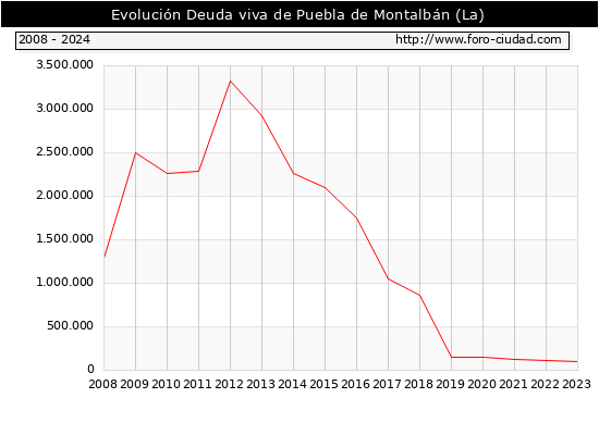 La Puebla de Montalbán - Deuda viva del Ayuntamiento a 31/12/2024 La Puebla de Montalbán - Deuda viva del Ayuntamiento a 31/12/2024 Segun el Ministerio de Economia y Hacienda el Ayuntamiento de La Puebla de Montalbán a 31/12/2024 posee una deuda de 84.000 € . La deuda viva a 31/12/2023 ascendia a 100.000 € por lo que en el ultimo año la deuda se redujo en -16.000 €. ![]()