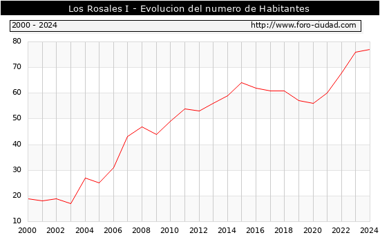 el numero de habitantes en Los Rosales I era de 77, 1 habitantes mas que el en el año 2023. En el grafico siguiente se puede ver cuantos habitantes tiene Los Rosales I a lo largo de los años.
