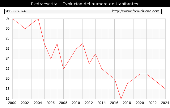 el numero de habitantes en Piedraescrita era de 18, 1 habitantes menos que el en el año 2023. En el grafico siguiente se puede ver cuantos habitantes tiene Piedraescrita a lo largo de los años.