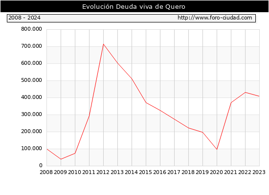 Quero - Deuda viva del Ayuntamiento a 31/12/2024 Quero - Deuda viva del Ayuntamiento a 31/12/2024 Segun el Ministerio de Economia y Hacienda el Ayuntamiento de Quero a 31/12/2024 posee una deuda de 501.000 € . La deuda viva a 31/12/2023 ascendia a 409.000 € por lo que en el ultimo año la deuda crecio en 92.000 €. ![]()