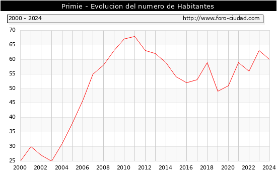 el numero de habitantes en Primie era de 60, 3 habitantes menos que el en el año 2023. En el grafico siguiente se puede ver cuantos habitantes tiene Primie a lo largo de los años.