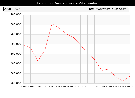 Villamuelas - Deuda viva del Ayuntamiento a 31/12/2024 Villamuelas - Deuda viva del Ayuntamiento a 31/12/2024 Segun el Ministerio de Economia y Hacienda el Ayuntamiento de Villamuelas a 31/12/2024 posee una deuda de 282.000 € . La deuda viva a 31/12/2023 ascendia a 276.000 € por lo que en el ultimo año la deuda crecio en 6.000 €. ![]()