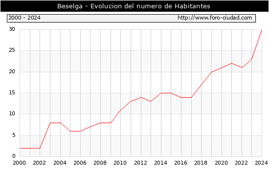 el numero de habitantes en Beselga era de 30, 7 habitantes mas que el en el año 2023. En el grafico siguiente se puede ver cuantos habitantes tiene Beselga a lo largo de los años.