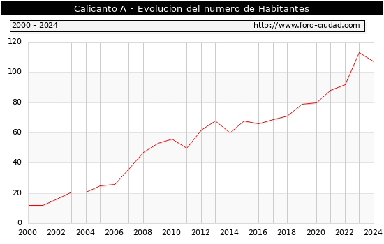el numero de habitantes en Calicanto A era de 107, 6 habitantes menos que el en el año 2023. En el grafico siguiente se puede ver cuantos habitantes tiene Calicanto A a lo largo de los años.