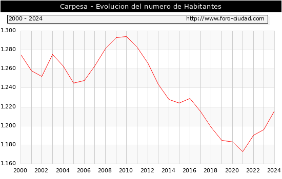el numero de habitantes en Carpesa era de 1.216, 20 habitantes mas que el en el año 2023. En el grafico siguiente se puede ver cuantos habitantes tiene Carpesa a lo largo de los años.