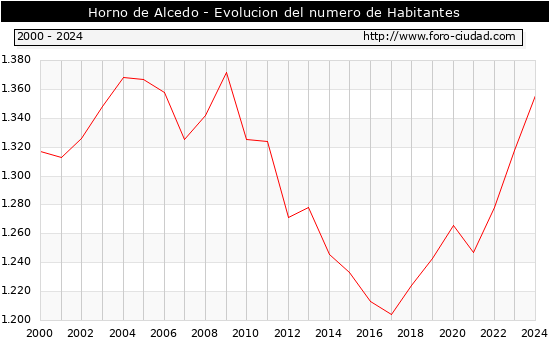 el numero de habitantes en Horno de Alcedo era de 1.356, 38 habitantes mas que el en el año 2023. En el grafico siguiente se puede ver cuantos habitantes tiene Horno de Alcedo a lo largo de los años.