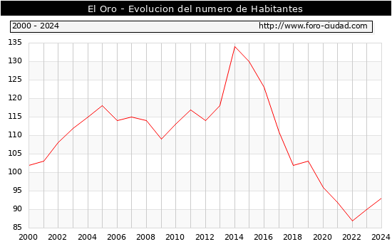 el numero de habitantes en El Oro era de 93, 3 habitantes mas que el en el año 2023. En el grafico siguiente se puede ver cuantos habitantes tiene El Oro a lo largo de los años.