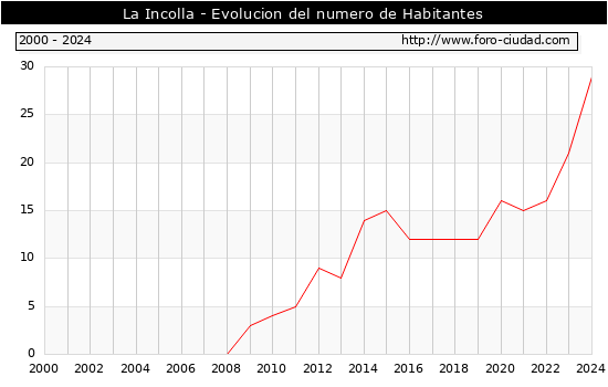 el numero de habitantes en La Incolla era de 29, 8 habitantes mas que el en el año 2023. En el grafico siguiente se puede ver cuantos habitantes tiene La Incolla a lo largo de los años.