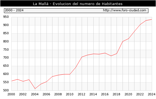 el numero de habitantes en La Mallá era de 937, 8 habitantes mas que el en el año 2023. En el grafico siguiente se puede ver cuantos habitantes tiene La Mallá a lo largo de los años.