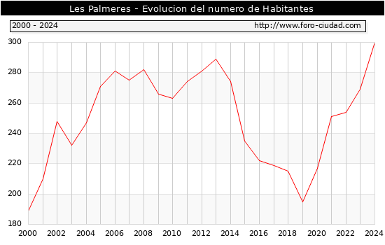 el numero de habitantes en Les Palmeres era de 300, 31 habitantes mas que el en el año 2023. En el grafico siguiente se puede ver cuantos habitantes tiene Les Palmeres a lo largo de los años.