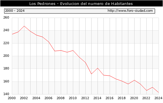 el numero de habitantes en Los Pedrones era de 143, 8 habitantes menos que el en el año 2023. En el grafico siguiente se puede ver cuantos habitantes tiene Los Pedrones a lo largo de los años.