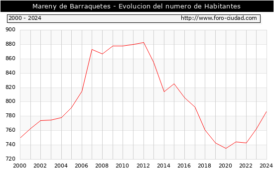 el numero de habitantes en Mareny de Barraquetes era de 787, 25 habitantes mas que el en el año 2023. En el grafico siguiente se puede ver cuantos habitantes tiene Mareny de Barraquetes a lo largo de los años.