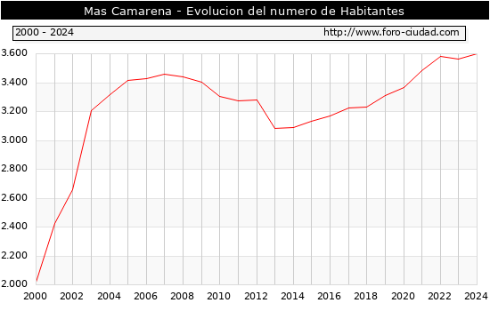 el numero de habitantes en Mas Camarena era de 3.597, 35 habitantes mas que el en el año 2023. En el grafico siguiente se puede ver cuantos habitantes tiene Mas Camarena a lo largo de los años.
