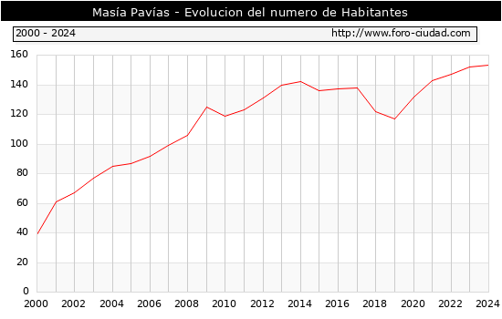 el numero de habitantes en Masía Pavías era de 153, 1 habitantes mas que el en el año 2023. En el grafico siguiente se puede ver cuantos habitantes tiene Masía Pavías a lo largo de los años.