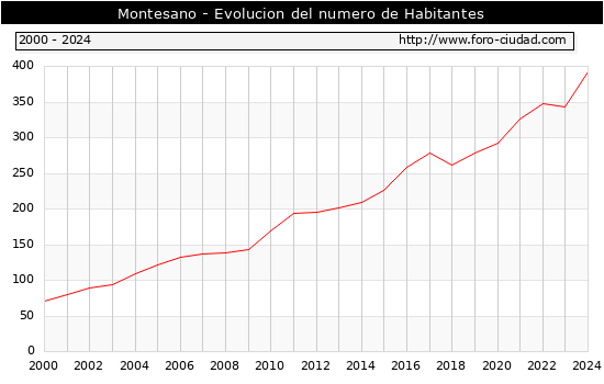 el numero de habitantes en Montesano era de 393, 50 habitantes mas que el en el año 2023. En el grafico siguiente se puede ver cuantos habitantes tiene Montesano a lo largo de los años.
