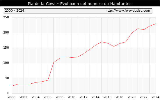 el numero de habitantes en Pla de la Cova era de 230, 8 habitantes mas que el en el año 2023. En el grafico siguiente se puede ver cuantos habitantes tiene Pla de la Cova a lo largo de los años.