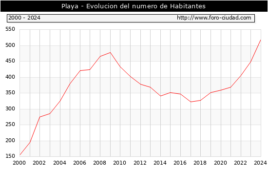 el numero de habitantes en Playa era de 520, 71 habitantes mas que el en el año 2023. En el grafico siguiente se puede ver cuantos habitantes tiene Playa a lo largo de los años.