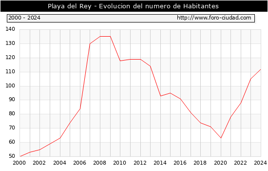 el numero de habitantes en Playa del Rey era de 112, 7 habitantes mas que el en el año 2023. En el grafico siguiente se puede ver cuantos habitantes tiene Playa del Rey a lo largo de los años.