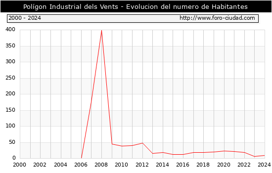 el numero de habitantes en Polígon Industrial dels Vents era de 9, 3 habitantes mas que el en el año 2023. En el grafico siguiente se puede ver cuantos habitantes tiene Polígon Industrial dels Vents a lo largo de los años.
