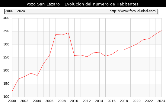 el numero de habitantes en Pozo San Lázaro era de 354, 15 habitantes mas que el en el ańo 2023. En el grafico siguiente se puede ver cuantos habitantes tiene Pozo San Lázaro a lo largo de los ańos.