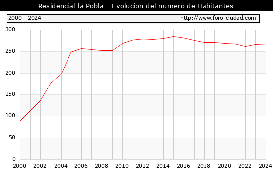 el numero de habitantes en Residencial la Pobla era de 265, 1 habitantes menos que el en el año 2023. En el grafico siguiente se puede ver cuantos habitantes tiene Residencial la Pobla a lo largo de los años.