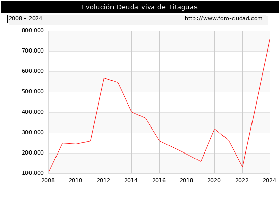 Titaguas - Deuda viva del Ayuntamiento a 31/12/2024 Titaguas - Deuda viva del Ayuntamiento a 31/12/2024 Segun el Ministerio de Economia y Hacienda el Ayuntamiento de Titaguas a 31/12/2024 posee una deuda de 763.000 € . La deuda viva a 31/12/2023 ascendia a 447.000 € por lo que en el ultimo año la deuda crecio en 316.000 €. ![]()
