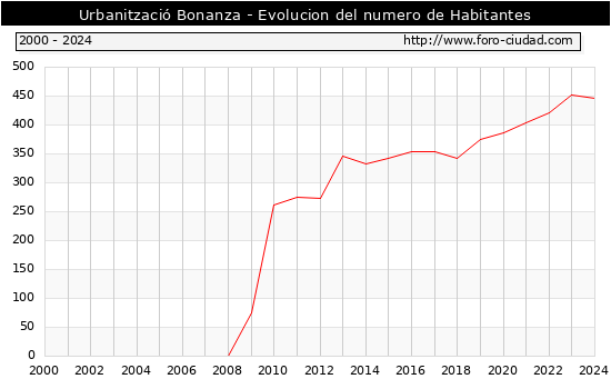 el numero de habitantes en Urbanització Bonanza era de 446, 6 habitantes menos que el en el año 2023. En el grafico siguiente se puede ver cuantos habitantes tiene Urbanització Bonanza a lo largo de los años.