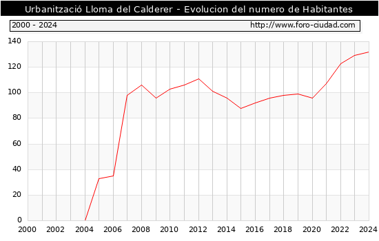 el numero de habitantes en Urbanització Lloma del Calderer era de 132, 3 habitantes mas que el en el ańo 2023. En el grafico siguiente se puede ver cuantos habitantes tiene Urbanització Lloma del Calderer a lo largo de los ańos.