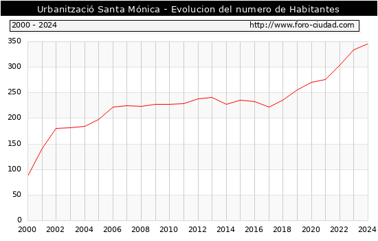el numero de habitantes en Urbanització Santa Mónica era de 346, 12 habitantes mas que el en el año 2023. En el grafico siguiente se puede ver cuantos habitantes tiene Urbanització Santa Mónica a lo largo de los años.