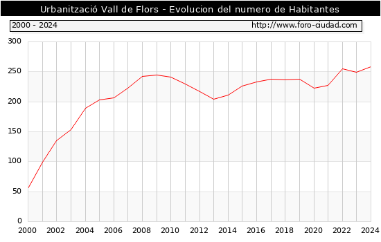 el numero de habitantes en Urbanització Vall de Flors era de 258, 9 habitantes mas que el en el ańo 2023. En el grafico siguiente se puede ver cuantos habitantes tiene Urbanització Vall de Flors a lo largo de los ańos.