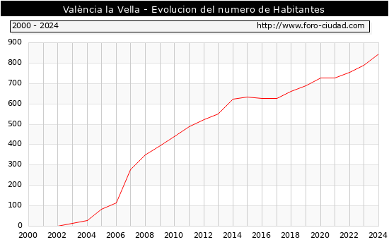 el numero de habitantes en Valčncia la Vella era de 845, 57 habitantes mas que el en el ańo 2023. En el grafico siguiente se puede ver cuantos habitantes tiene Valčncia la Vella a lo largo de los ańos.