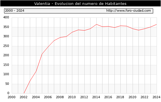 el numero de habitantes en Valentia era de 365, 14 habitantes mas que el en el año 2023. En el grafico siguiente se puede ver cuantos habitantes tiene Valentia a lo largo de los años.