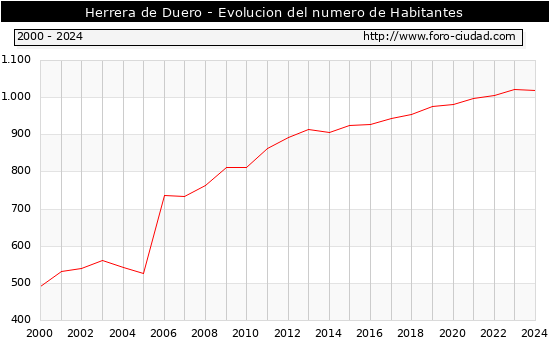 el numero de habitantes en Herrera de Duero era de 1.018, 3 habitantes menos que el en el año 2023. En el grafico siguiente se puede ver cuantos habitantes tiene Herrera de Duero a lo largo de los años.
