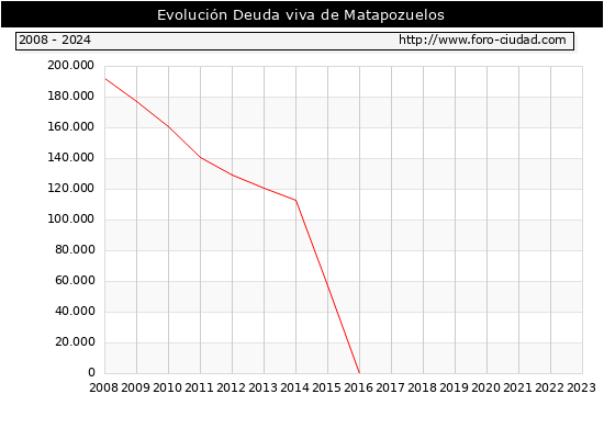 Matapozuelos - Deuda viva del Ayuntamiento a 31/12/2024 Matapozuelos - Deuda viva del Ayuntamiento a 31/12/2024 Segun el Ministerio de Economia y Hacienda el Ayuntamiento de Matapozuelos a 31/12/2024 posee una deuda de 0 € . La deuda viva a 31/12/2023 ascendia a 0 € por lo que en el ultimo año la deuda se mantuvo igual. ![]()